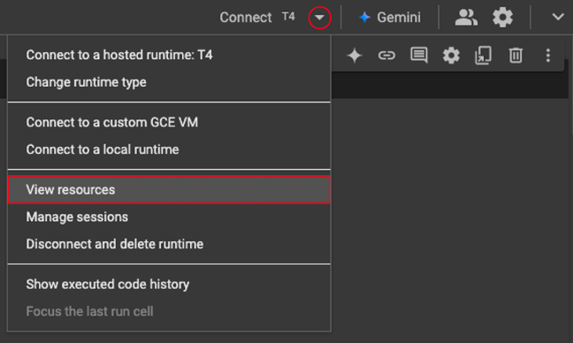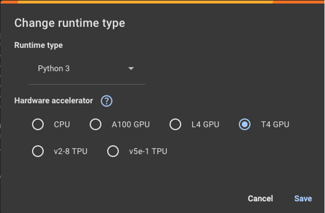 Click on ‘Connect’ (upper right) and select ‘T4 GPU’ under ‘Hardware accelerator’. NOTE: L4 and A100 GPUs will perform faster but cost more to run. Phage genomes are generally small and do not require heavy computational resources.