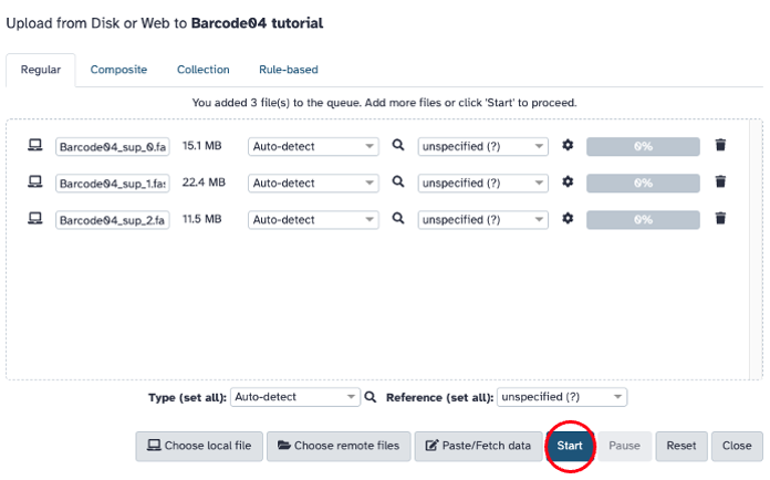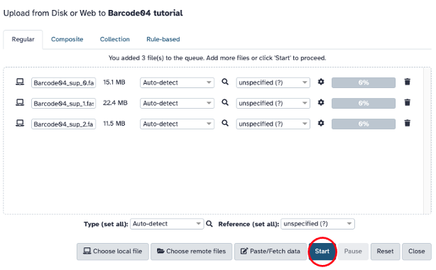 Upload data (FASTQ or FASTQ.GZ) on the upper left hand side of the screen. Drag and drop file(s) to the screen or select ‘Choose local file’. Click start to upload the file(s). On the right hand side of the screen, files that have been uploaded successfully will turn green on the right hand side of the screen.