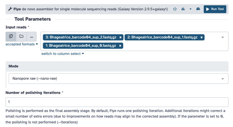 For the following steps, you will use the Flye software on Galaxy to assemble reads.