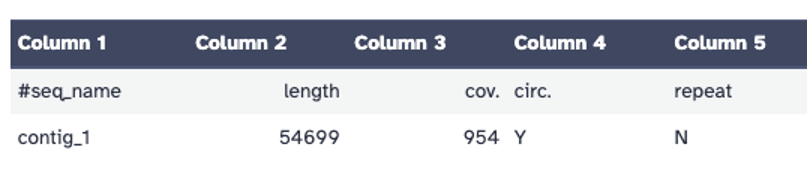 : contains contig number, length (bp), mean coverage , circular (yes/no), repeat (yes/no)
