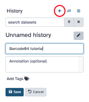 Add a new history by clicking the ‘+’ on the upper right hand side of the screen and name the history. Click ‘Save’.