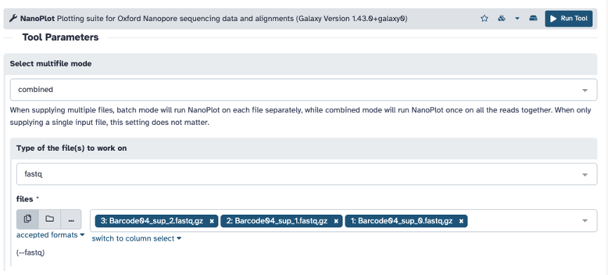Select FASTQ or FASTQ.GZ file if using one file and click ‘Run Tool’. You can also change the option under ‘Select multifile mode’ from ‘batch’ to ‘combined’ to add multiple files.