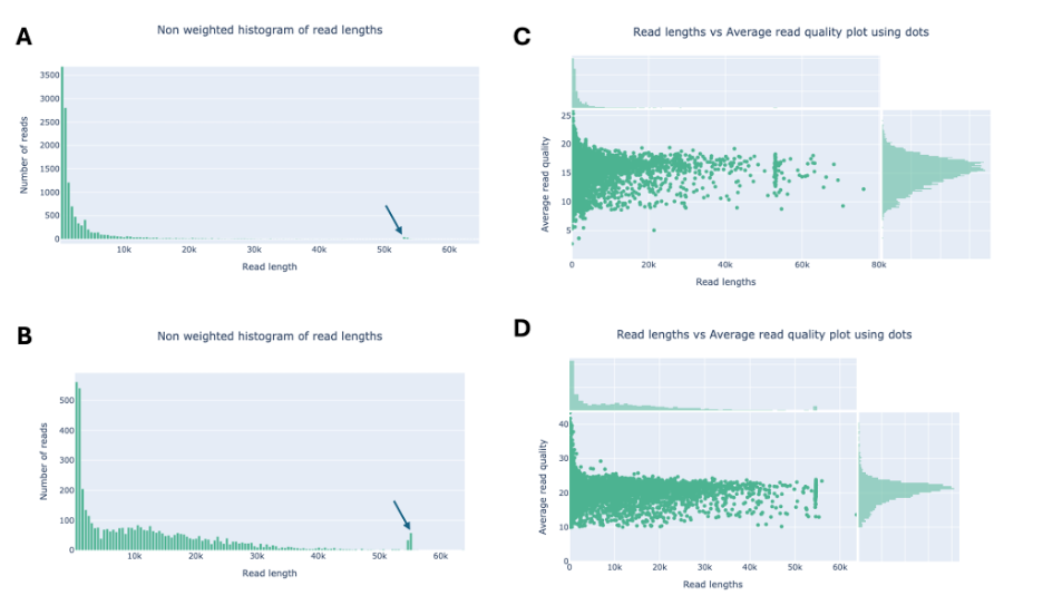 Figure 1 (A-D). Nanoplot plots of the read lengths (A, B) and read lengths vs. average read quality (C, D) for phages BillyTP (A, C) and Bhageatrice (B, D). The blue arrows in Figs. 2A and B are showing reads that are approximately the size of the phage genomes.